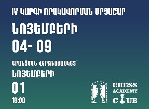 Ս/թ. նոյեմբերի 4-ից 9-ը Հայաստանի շախմատի ակադեմիան «Շախմատի ակադեմիայի ակումբ»-ի հետ համատեղ կազմակերպում է IV կարգի որակավորման մրցաշար: