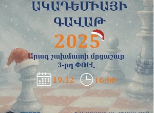 Ս/թ. դեկտեմբերի 19-ին, ժամը 16:00-ին Հայաստանի շախմատի ակադեմիան կազմակերպում է «Շախմատի ակադեմիայի գավաթ - 2025» արագ շախմատի մրցաշարի եզրափակիչ փուլը: