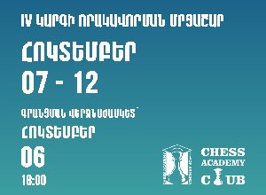 Ս/թ. հոկտեմբեերի 07-ից 12-ը Հայաստանի շախմատի ակադեմիան «Շախմատի ակադեմիայի ակումբ»-ի հետ համատեղ կազմակերպում է IV կարգի որակավորման մրցաշար`առանց տարիքային սահմանափակման։