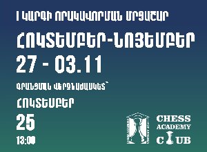 Ս/թ. հոկտեմբերի 27-ից նոյեմբերի 3-ը Հայաստանի շախմատի ակադեմիան «Շախմատի ակադեմիայի ակումբ»-ի հետ համատեղ կազմակերպում է I կարգի որակավորման մրցաշար: